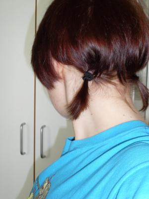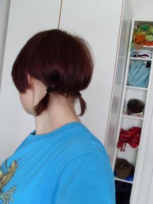 Es nennt sich dunkles Mahagoni und passt besser zu meinen schwarzen Augebrauen als die Zwiebelfarbe. [Und meine Körperhaltung sieht nur so bescheuert aus, weil ich mich nicht besonders gut von der Seite & mit abgewendetem Kopf knipsen kann]