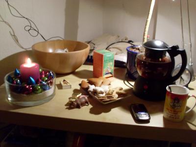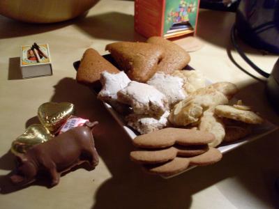 Lebkuchen (schön weich), Zimtsterne (mit Kruste und herrlich weichem Kern) & Zimt-Schoko-Hörnchen (lecker), Pfefferkuchen (dänischer Import) & Mürbeteigplätzchen (zergehen auf der Zunge). Die Popcorn-Erdnuss-Hügel werde ich vermutlich erst nächste Woche machen, zusammen mit den Schmalznüssen (sofern mir eine gewisse Mutter nochmal das Rezept zukommen lässt...).