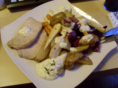 Und btw: Ofengemüse schmeckt mit Thymian-Creme & Schweinesteaks sehr, sehr lecker :-P (obwohl ich annehme, dass man auf das Fleisch auch verzichten könnte)